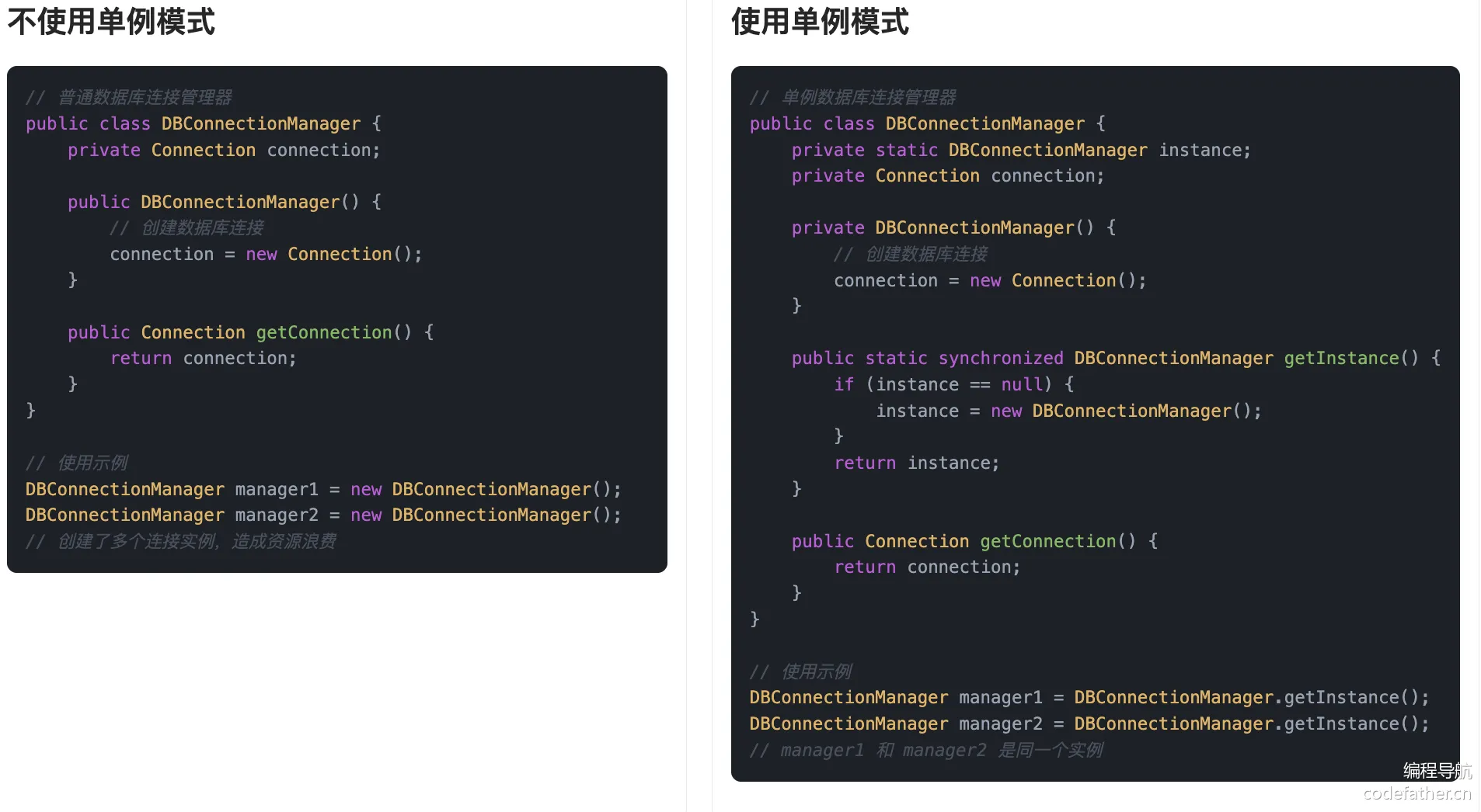 对于全局只会使用一个实例的类,使用单例模式减少频繁创建销毁的性能开销