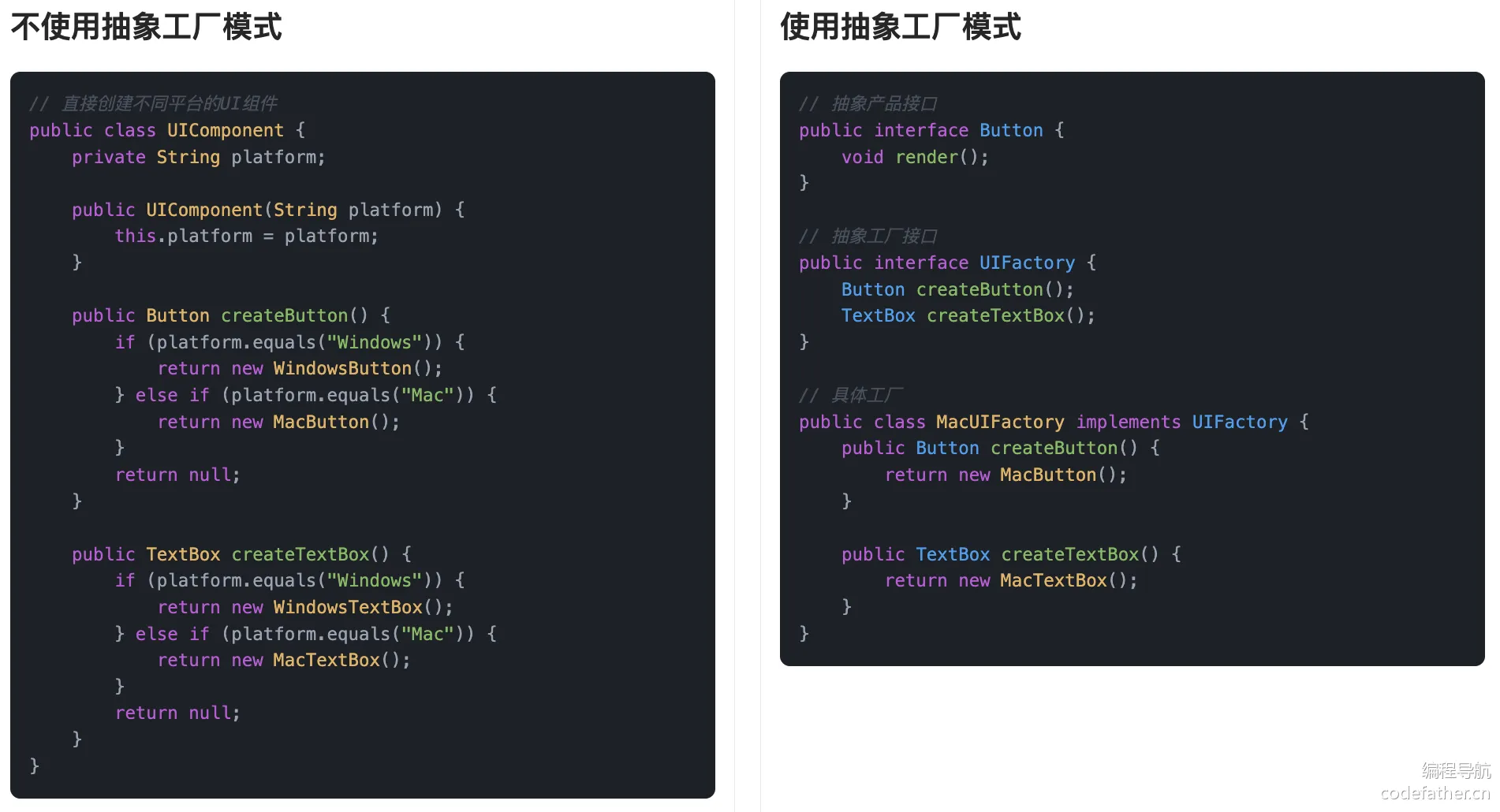 定义了一整套产品的创建方؜式,比如一个平台的 UI؜ 应该同时有按钮、文本框⁡、图片,全部由一个工厂统‍一生产,保证风格一致