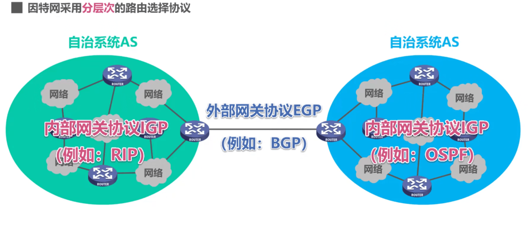 内部网关协议:用于自治系统 AS 内不使用,如 RIP、OSPF