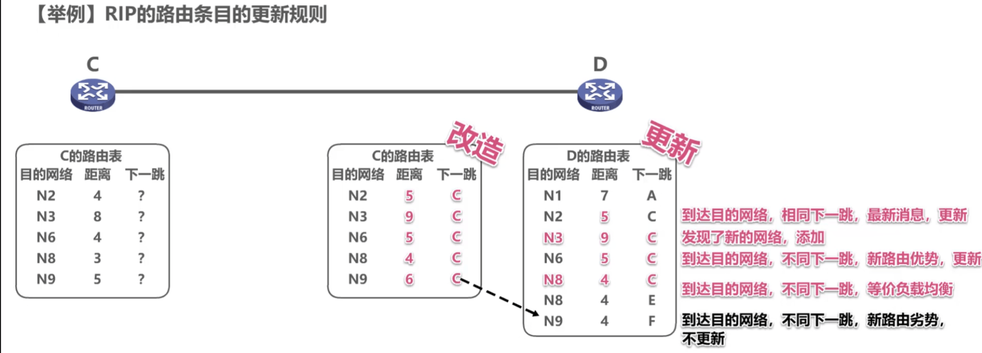 已知网络,不同下一跳,新路由短:更新