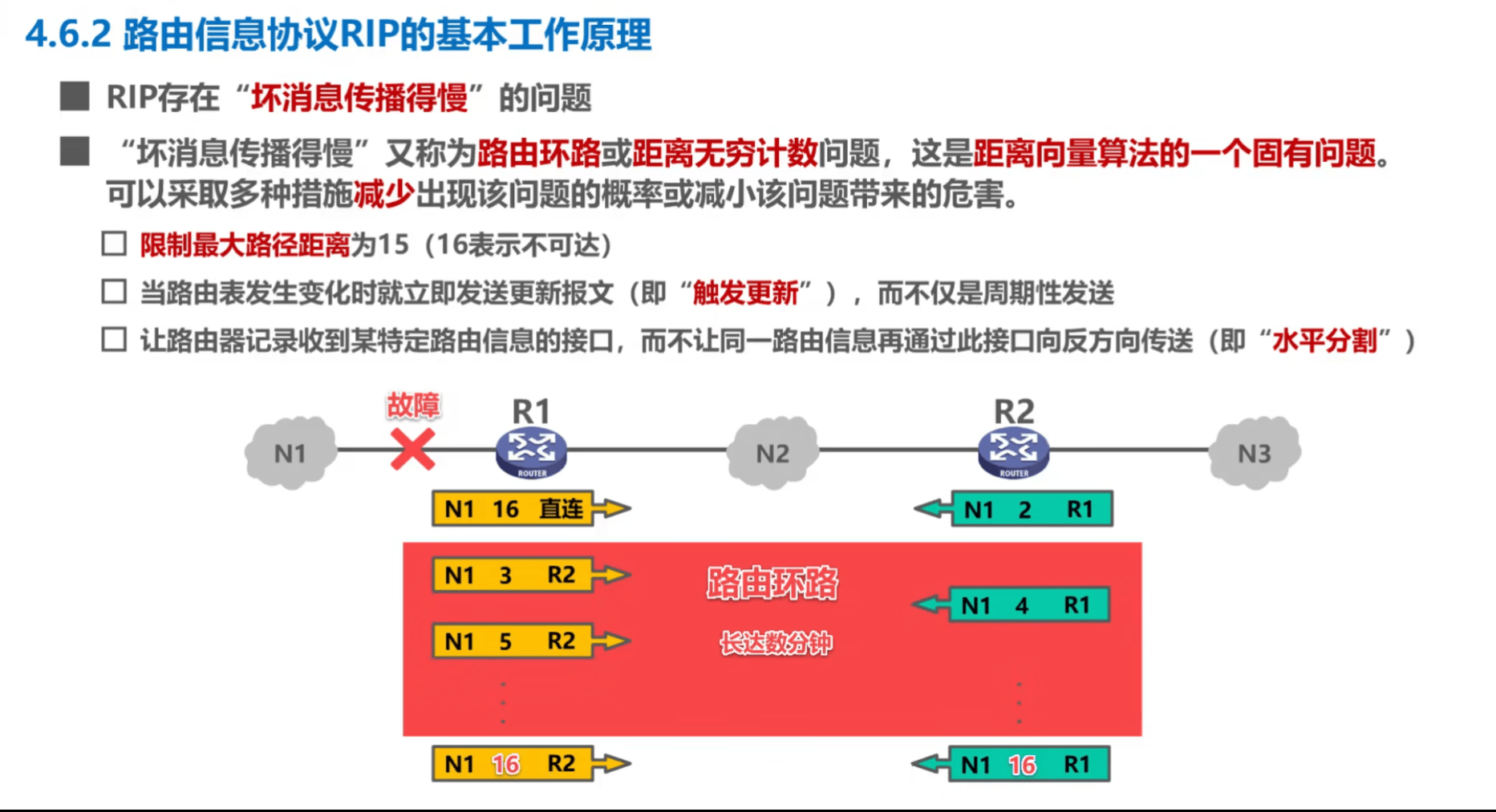当网络故障,相邻路由器将距离修改为 16 ,但此时被其他路由器更新,会形成更新回路,最终距离递增为 16 停止。导致故障消息产生慢