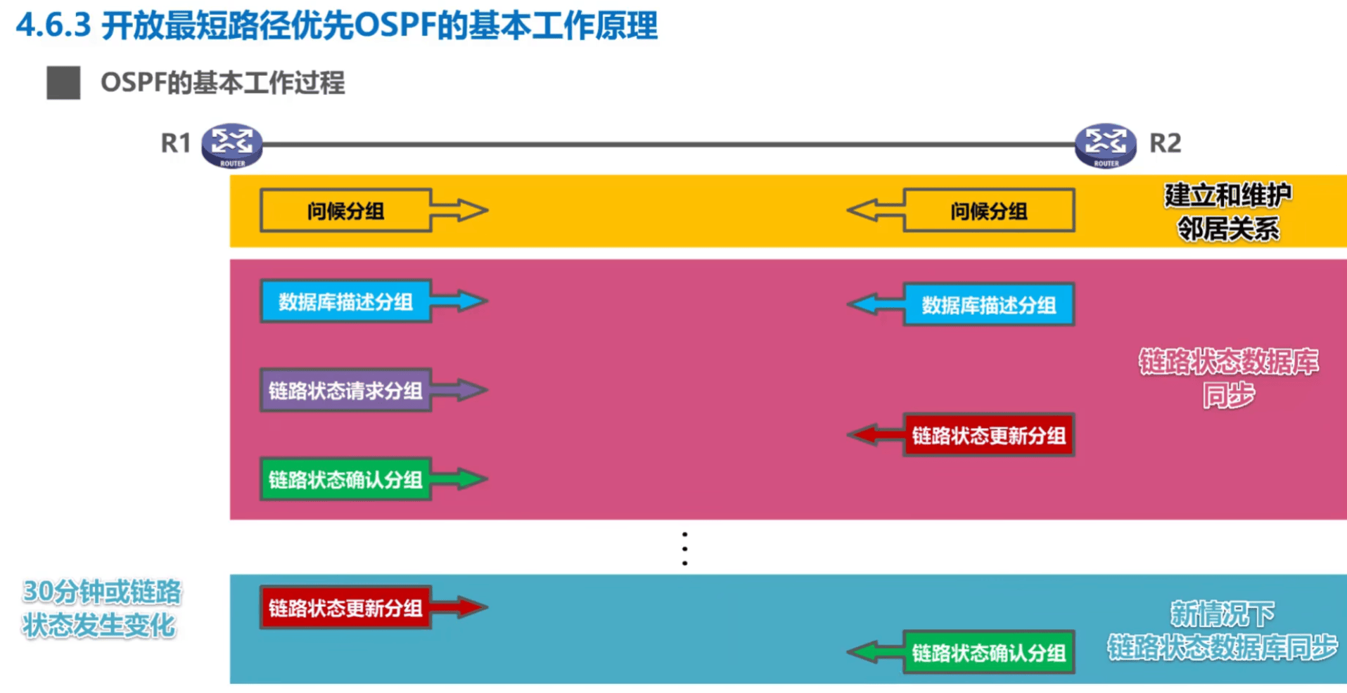2)同步数据库:首先发送数据库描述分组,接着是链路状态的请求、更新、确认