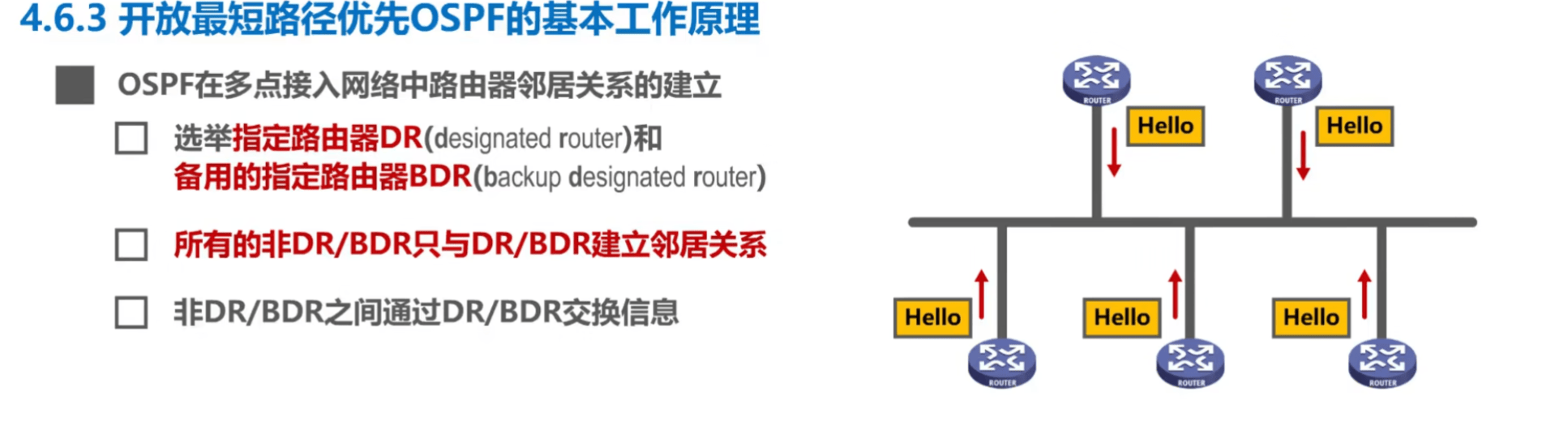 2)所有其他路由器只与当前 DR 建立邻居关系,且只通过当前 DR 交换信息