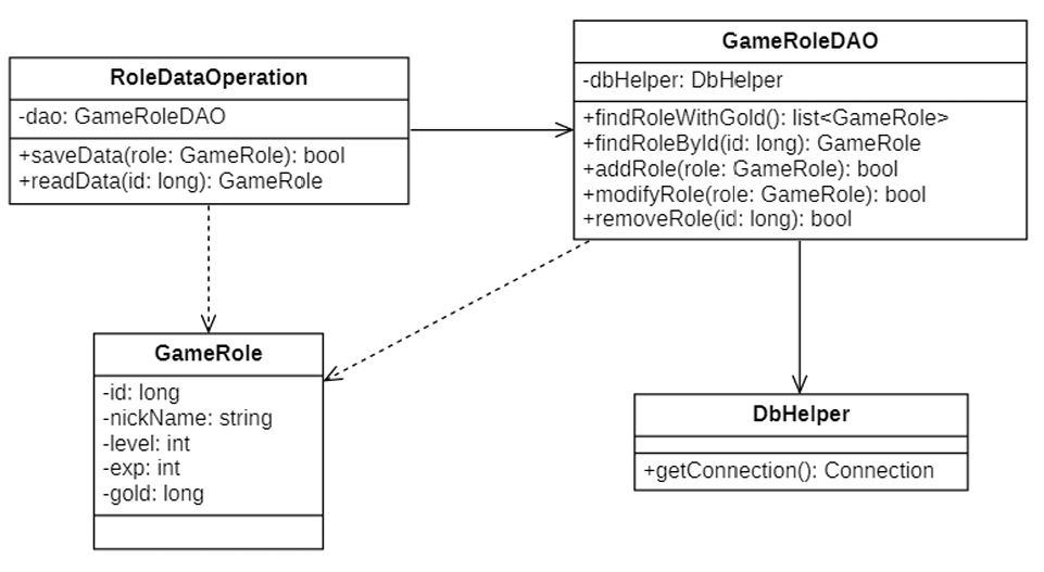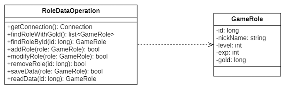 1)改进前RoleDataOperation类,承载了“数据库连接”、“数据库数据操作”和“存档数据”三种功能,不符合单一职责原则