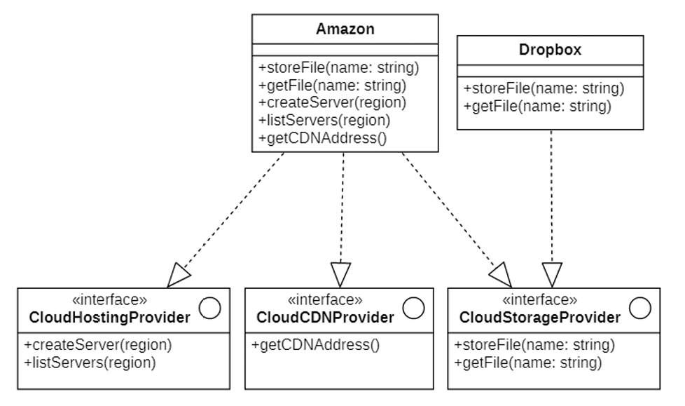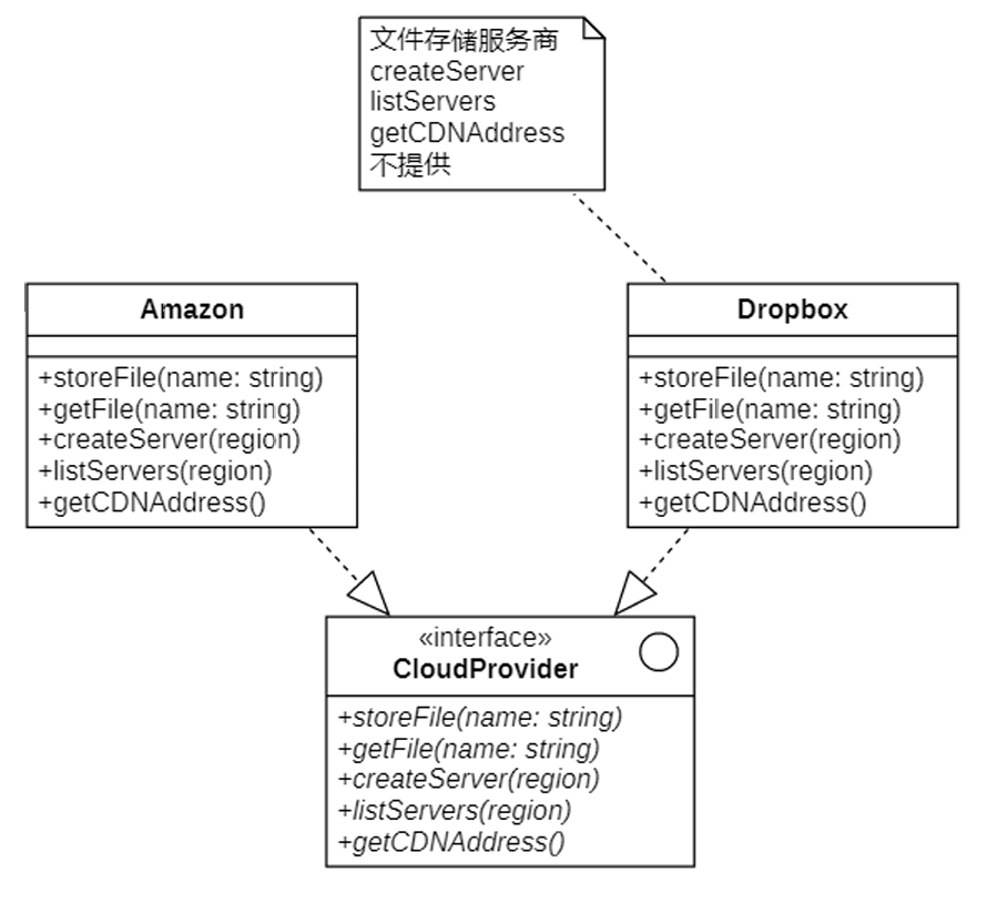 1)Amazon类与Dropbox类都必须实现接口中的五个方法,但实际上Dropbox类不需要不提供其中三个方法