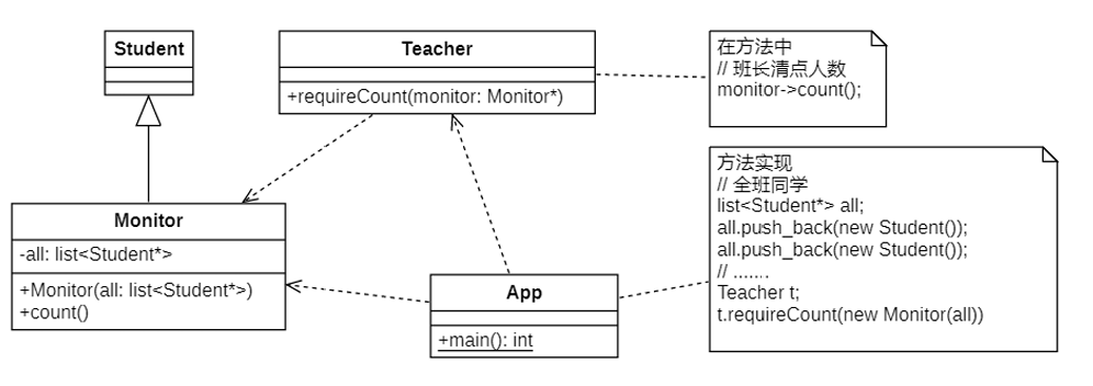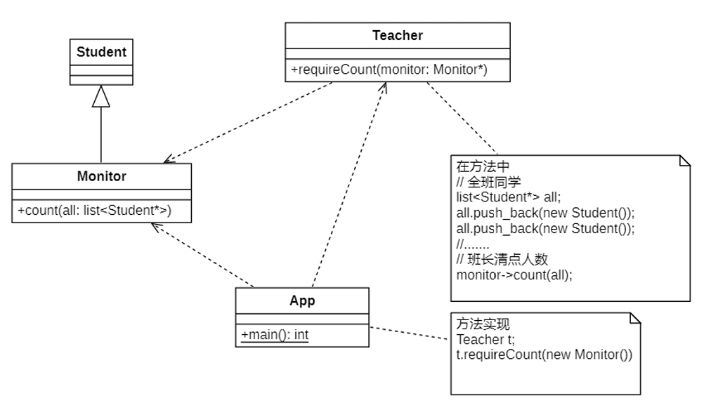 1)在示例中Teacher类对“非直接对象”Student类进行了通信,违背迪米特法则