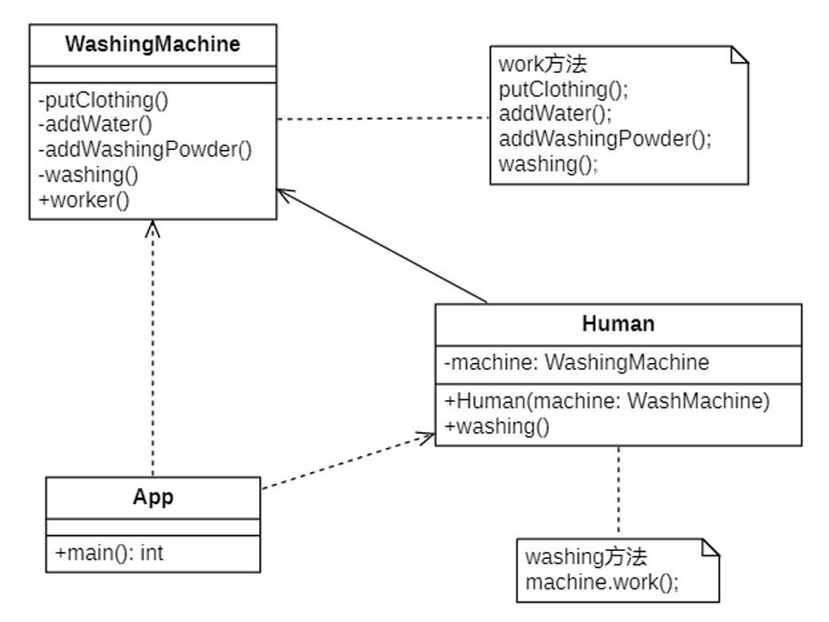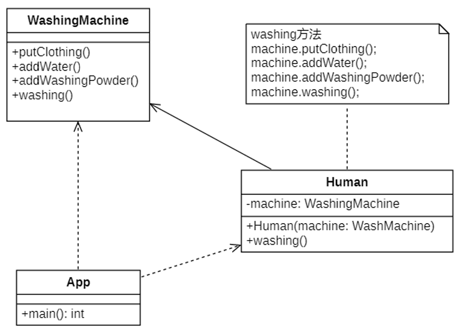 1)在示例中WashingMachinge方法对外暴露了所有方法。导致Human类需要进行过多的操作且可能发生错误。