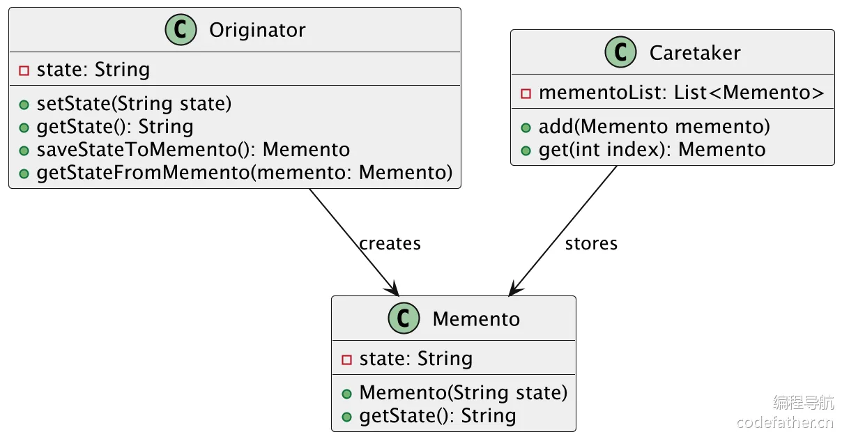 1)发起人‏(Originat؜or):需要保存状؜态的对象,负责创建⁡和恢复备忘录